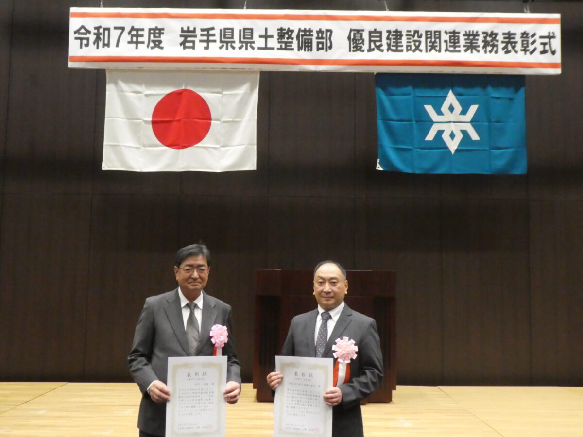 令和7年12月18日(木)に令和7年度 岩手県県土整備部 優良建設関連業務表彰式が執り行われ、当社は下記の業務にて表彰されました。